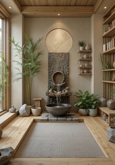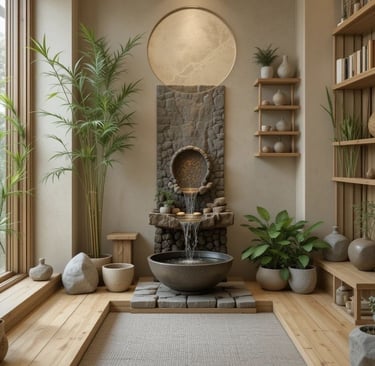 La décoration zen est discrète mais significative. Quelques éléments suffisent : un vase en céramique, une plante verte, une pierre polie, un tableau abstrait ou un calligraphe japonais. Les plantes comme les bonsaïs, les fougères ou les bambous renforcent la connexion à la nature et à la lenteur.
