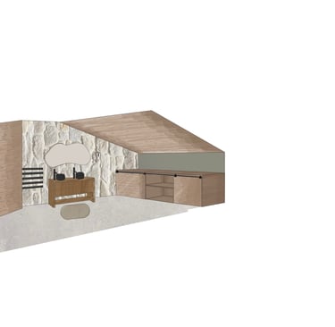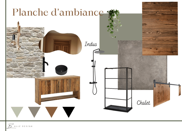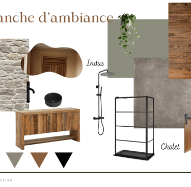 Avant même de passer à la 3D, j’ai conçu une planche d’ambiance qui a servi de base au projet. Elle reflète une intention claire : associer des matières naturelles à des lignes contemporaines.
