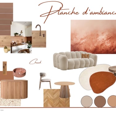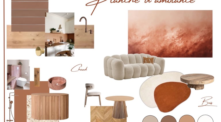 Tout part d’une volonté forte : créer un espace de vie où l’on se sent bien, en jouant sur des matières enveloppantes, des lignes douces et une palette de couleurs chaudes. La planche d’ambiance, que vous pouvez découvrir ci-dessous, reflète cette intention à travers un choix subtil de matériaux : bois naturel, textiles bouclés, terre cuite, laiton et courbes généreuses.