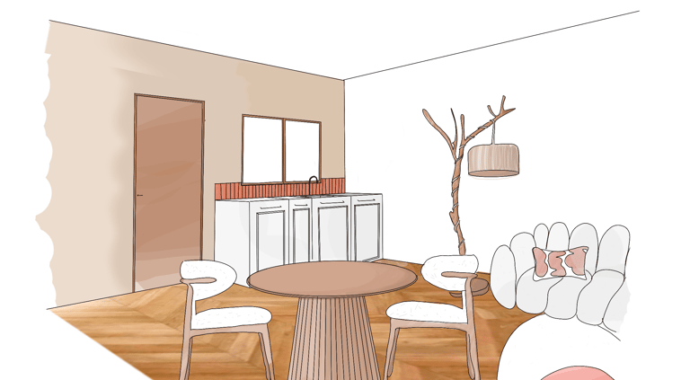 Du choix du luminaire suspendu, façon branche sculpturale, aux fauteuils galbés recouverts de tissu bouclé, chaque détail contribue à construire une ambiance douce et contemporaine. Le miroir au-dessus du plan de travail apporte, quant à lui, de la profondeur à la pièce et joue avec la lumière naturelle pour agrandir visuellement l’espace.